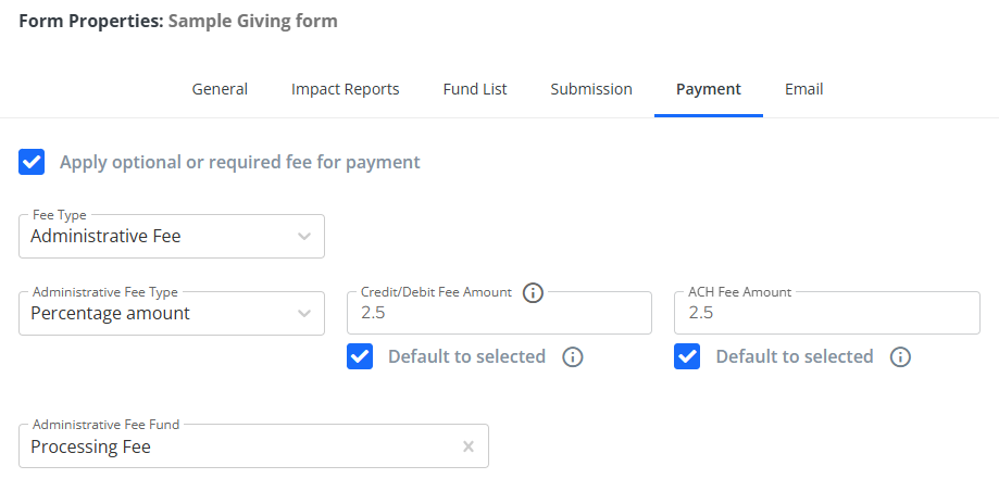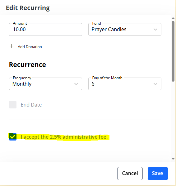 If they signed up for their gifts in Faith Direct and want to add it now that they have been moved over, they can still make the adjustment there are just a few additional steps. They can either edit their current recurring gift and add an additional line for the processing fees fund and they would have to calculate the offset percentage and then save their gifts. An easier solution would be to end the current recurring gift and then create a new one from the Give Now form (or the Giving form you have available) and then select to have the fees added. That way it is done for them.