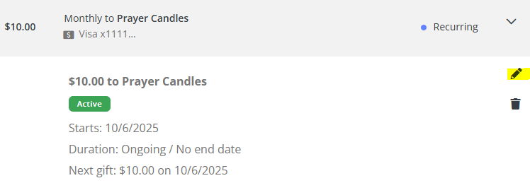 You as an admin also have access to add this to their account. We recommend that you end their current recurring gift and then process the new one through the Virtual Terminal.