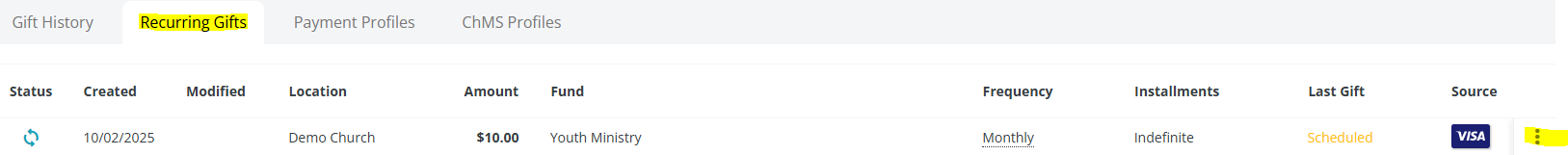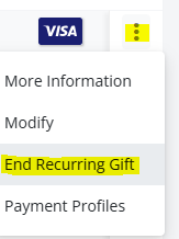 To do so, you would navigate to their donor account, go to their recurring gifts and then click the three dots across from the recurring gift and end the gift itself.