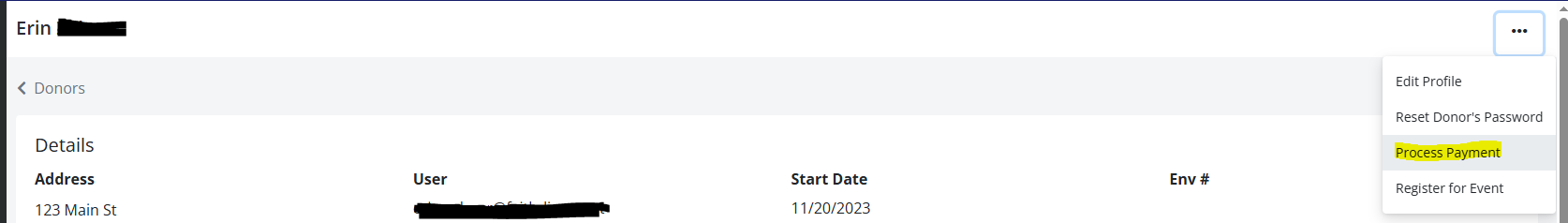 Then in the upper right hand corner, click on the three dots and process a payment. This will take you to the Virtual Terminal with that parishioner's information already populated.