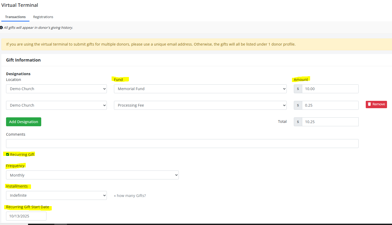 In the Virtual terminal, you'll need to select both the fund that they were giving to AND the processing fee fund. You'll need to calculate the fees as the VT will not do it for you. Below is an image of the fields that you will need to fill in. Note, it will only start with one fund to add, to add the processing fees fund, click 'add designation'.